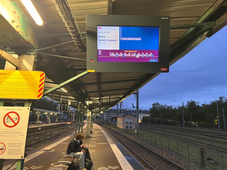 Rain in Paris and with three bags, we taxi between Saint-Lazare and Paris Nord. It’s Saturday, raining, and there’s road construction, so we still have a trek from where the taxi can let us off.