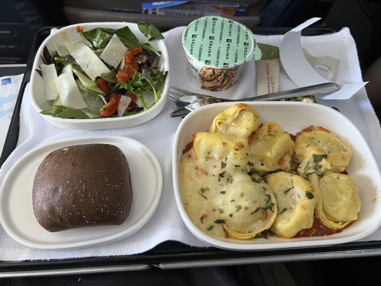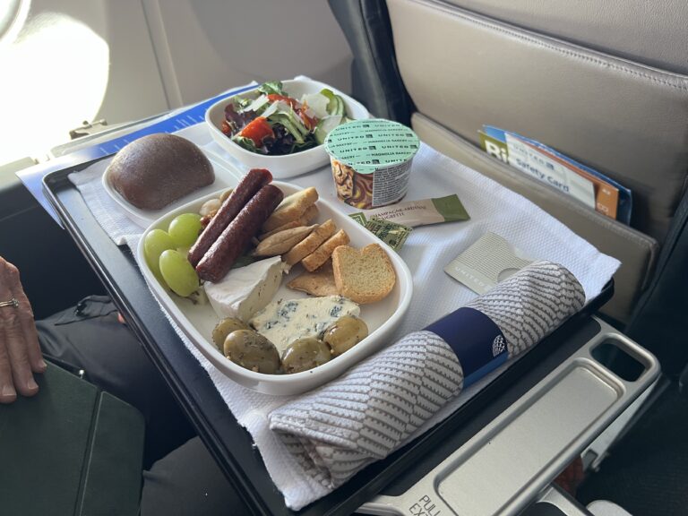 Lunch on the plane: Jan had a cheese plate and Richard had ravioli.