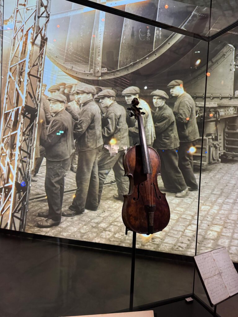 This is the violin belonging to Wallace Hartley that he played to comfort passengers during their final moments. He was lost in the disaster, but is remembered as a hero. Somehow the violin was recovered.