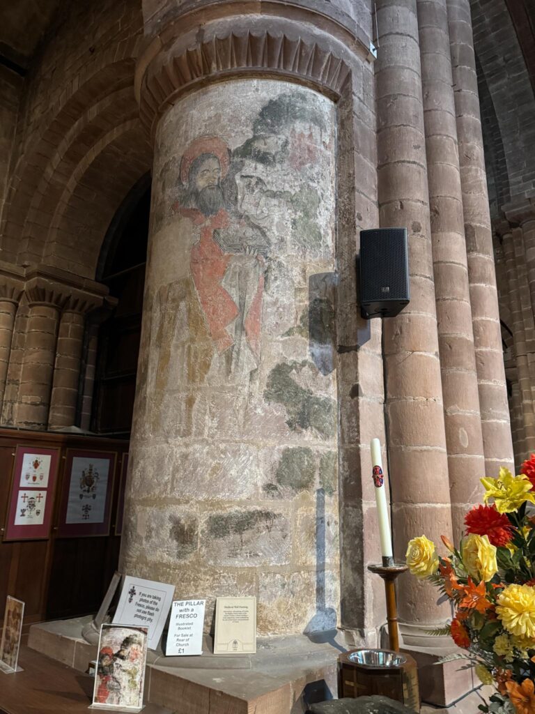 This column has a 14th century wall painting of St. John the Baptist, patron Saint of this church. He is shown holding a book supporting a lamb, symbolizing his role as forerunner and proclaimant of Christ.