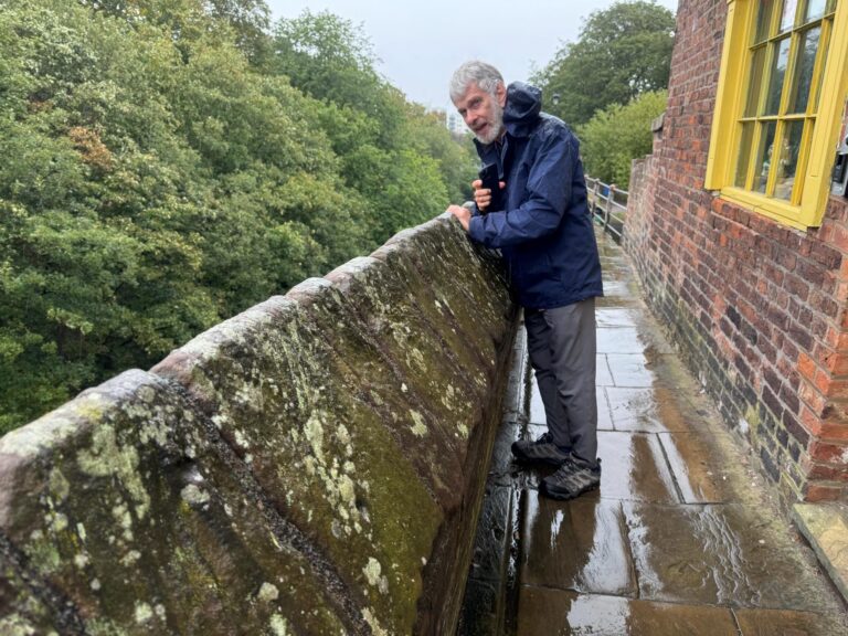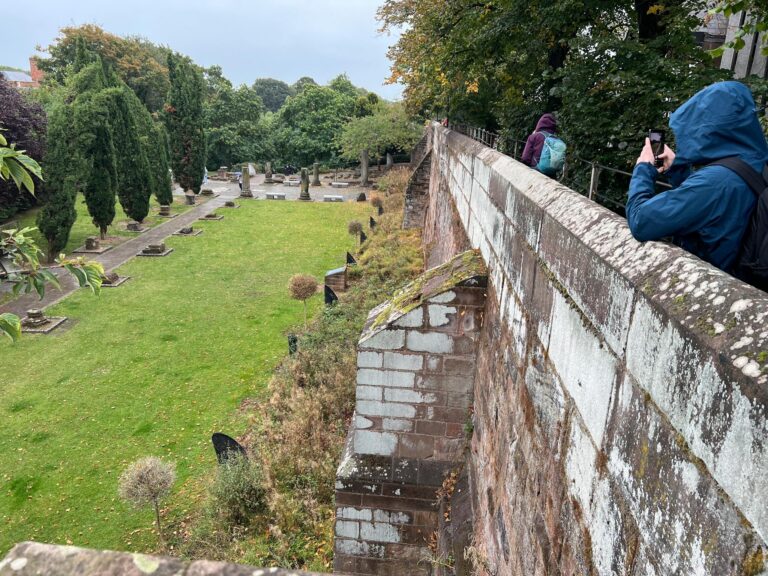 This is the spot for which we have been searching. Alice Roberts has a tv documentary on Chester where she rappelled over the wall to investigate the border between the ancient Roman wall and later additions. Then she spoke to an Italian restauranteur about his Roman history. We are confident we found the rappelling spot on the wall, but the Italian restaurant is gone.