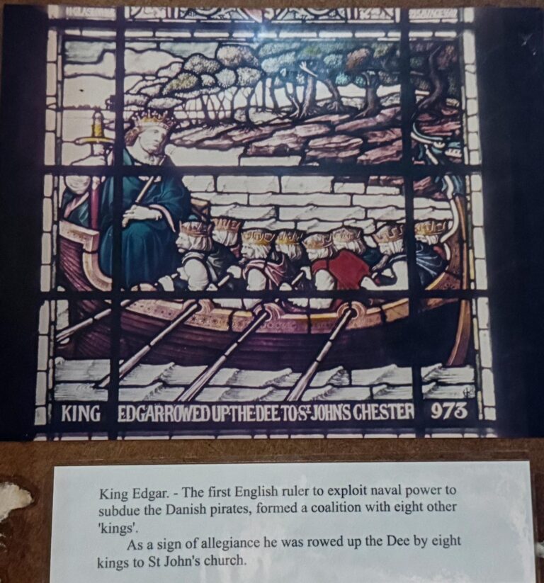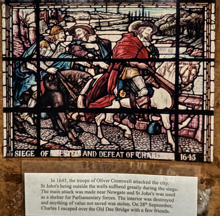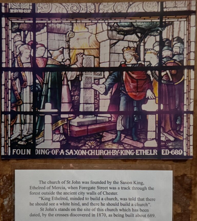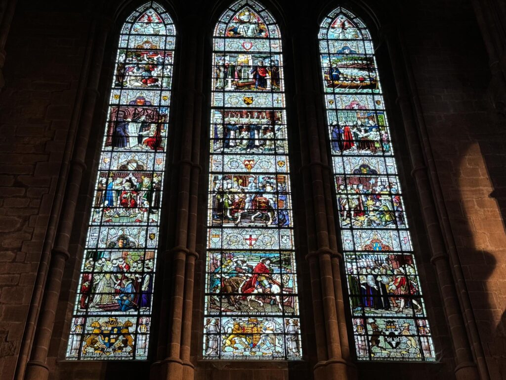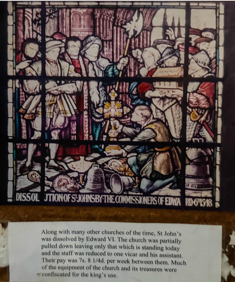 This unusual stained glass window (The Westminster Window) represents some of the historical events which occurred in and around St. John’s in its very long history. It was placed in the church in 1890, a gift by the first Duke of Westminster, to commemorate the Golden Jubilee of Her Majesty Queen Victoria in 1887.