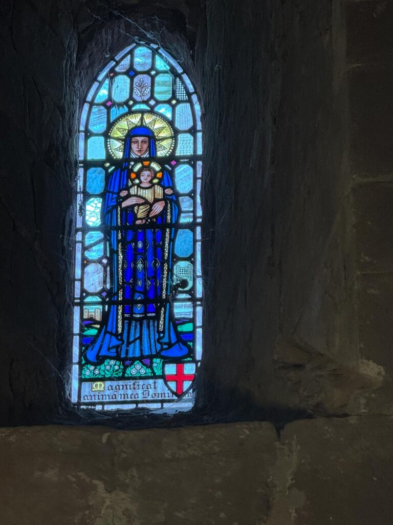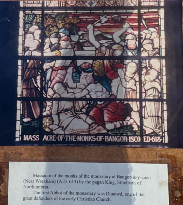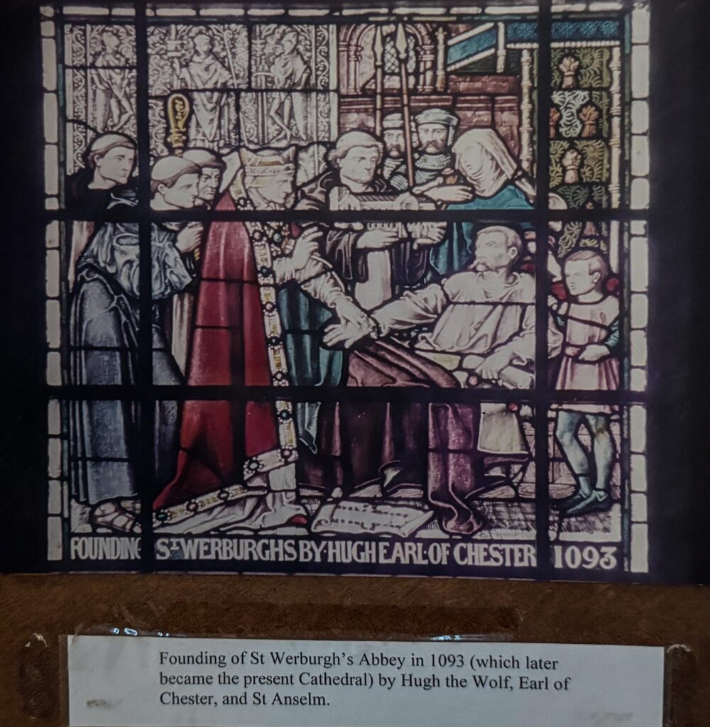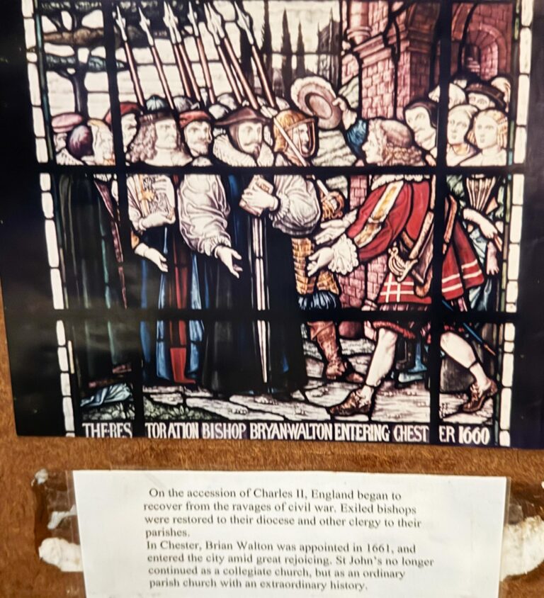 This unusual stained glass window (The Westminster Window) represents some of the historical events which occurred in and around St. John’s in its very long history. It was placed in the church in 1890, a gift by the first Duke of Westminster, to commemorate the Golden Jubilee of Her Majesty Queen Victoria in 1887.