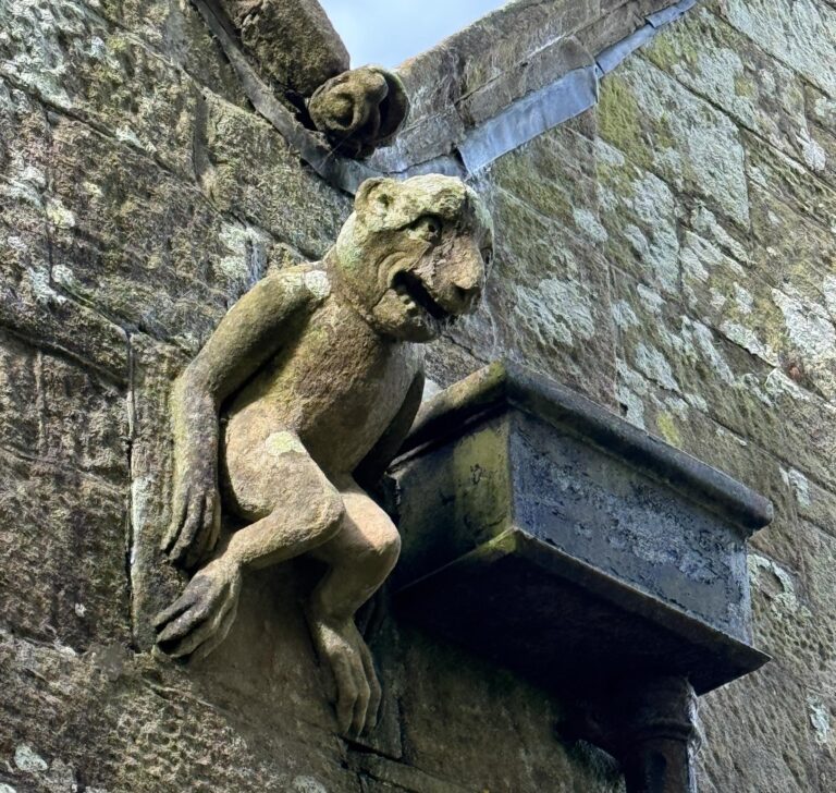 Gargoyles on the north side decorate the gutters. This dragon (see his pointed tail?) stands ready to channel water through his mouth.