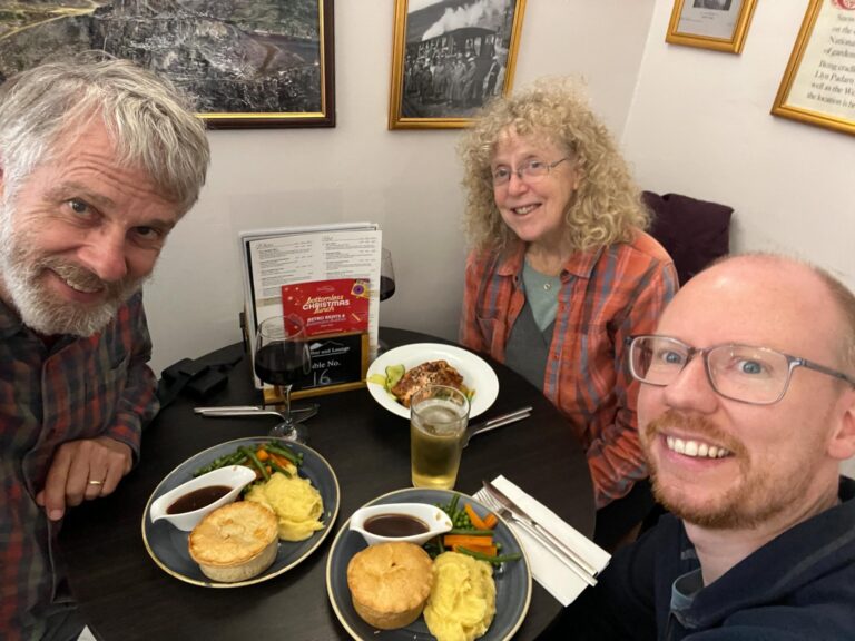 It’s been a busy day so we enjoyed dinner at a Llanberis restaurant. Simon and Richard had meat pies, and Jan had salmon.
