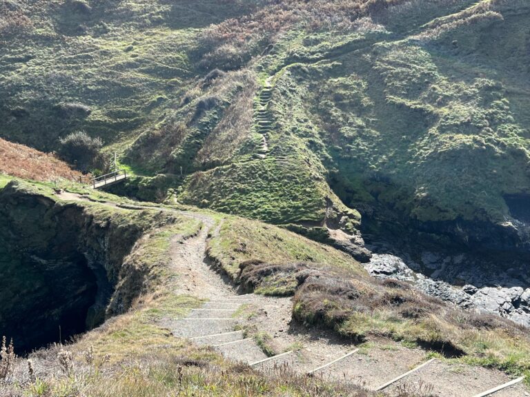 Fellow pilgrim, Louie, is waving across the inlet. It’s a long way down.