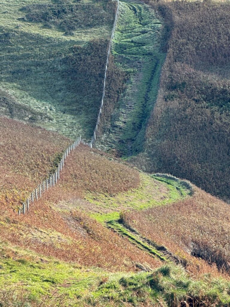 Farm fields sometimes follow the inlets toward the sea and sometimes they are parallel to the coast and we walk outside the fences.