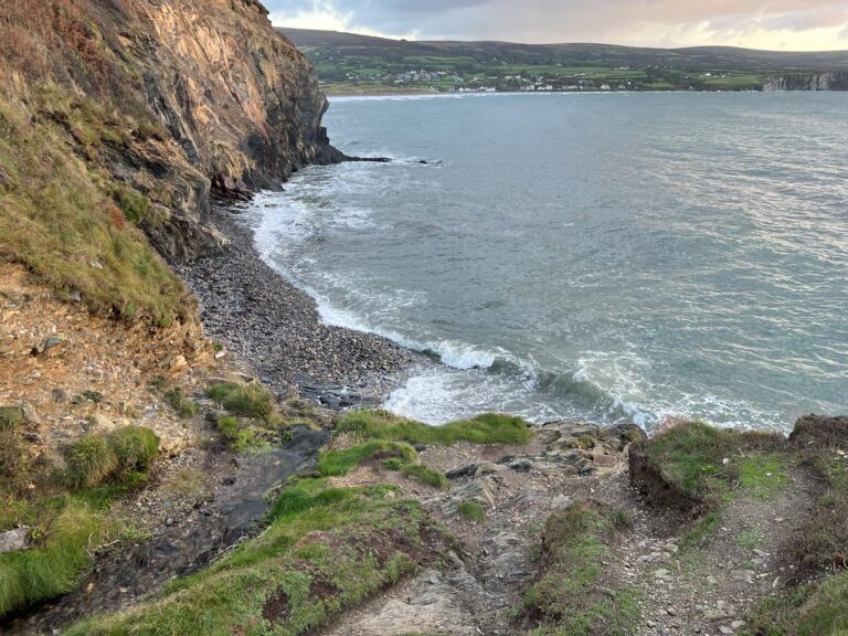 Sometimes the paths are dirt, sometimes grass, sometimes rocky dirt. Here we had steps to go down to the base of the inlet; it may be stairs up the other side or rocks to climb.