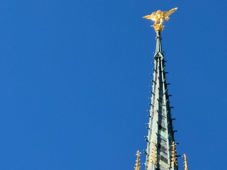 The spire atop the abbey is crowned by a statue of Saint Michael threatening a dragon, the embodiment of evil, with his sword. The statue is 4.5 meters high and is made of gilded copper.