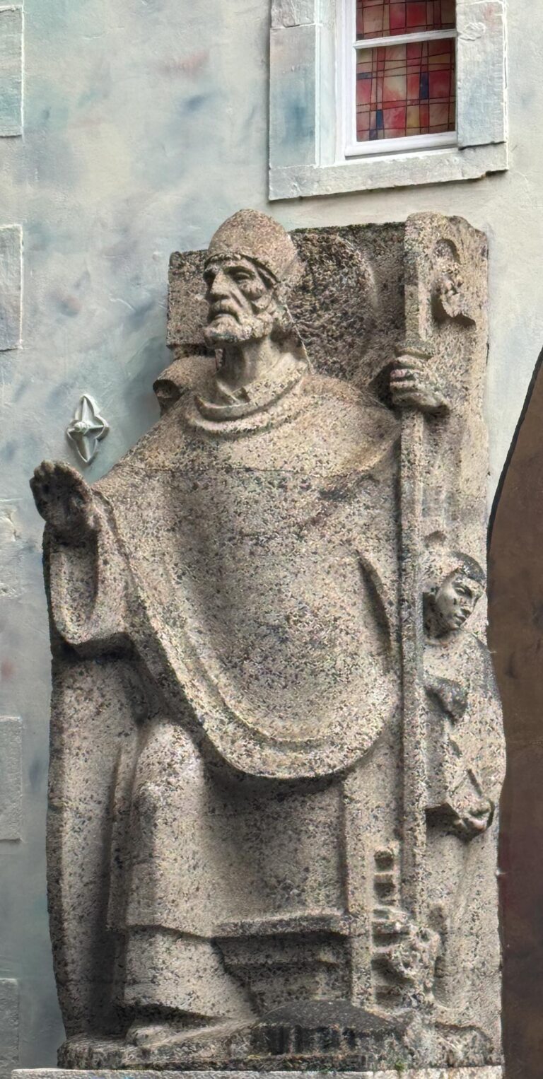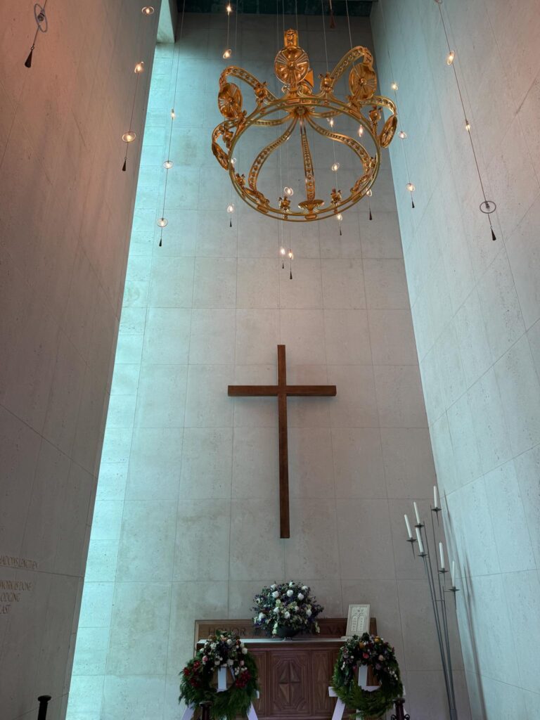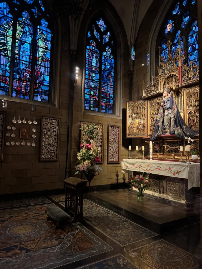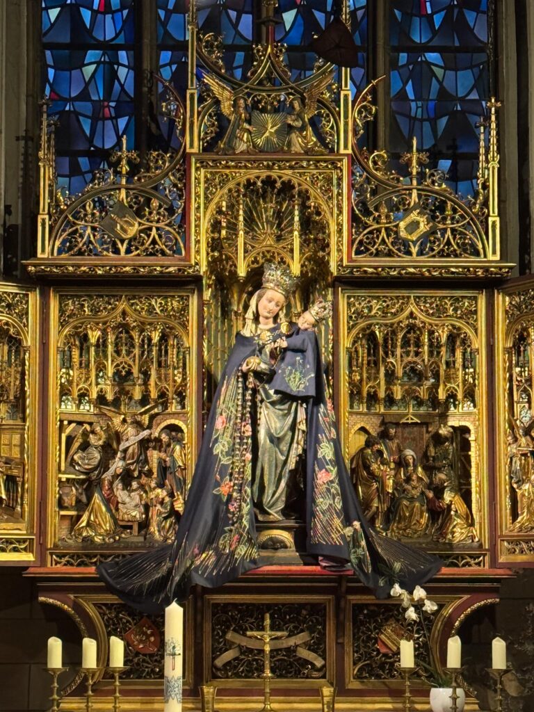 The side chapel holds a wooden statue of Mary as “Star of the Sea.” She was made about 1470 and has two capes that she wears: this blue one and a red one. Rina was not sure when or why she wore them, but she said she does not wear any cape during Advent. Students at the University make the capes,