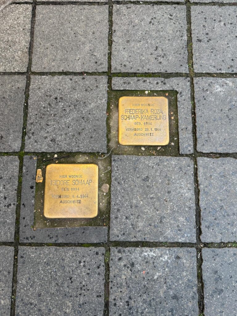 Fred explained these plaques installed in the sidewalk. These are reminders of residents who were taken away in WWII. Both of these people died (vermoord) in Auschwitz.
