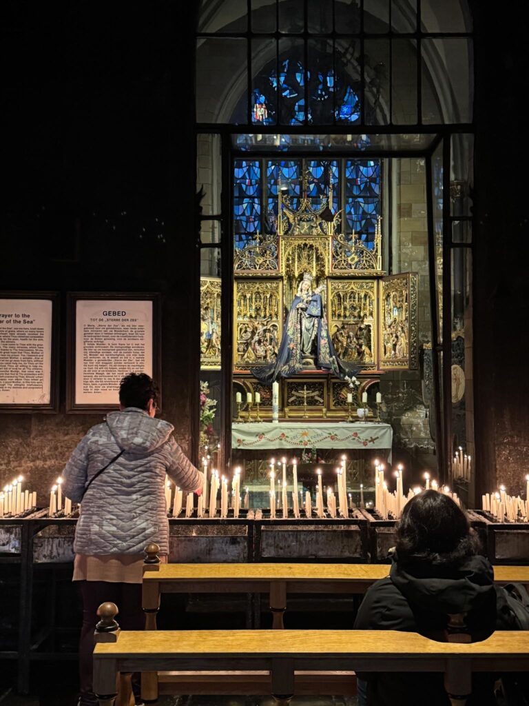 This is the chapel for the “Star of the Sea.” All who come here light a candle, so the church is dark from candle smoke over many years.