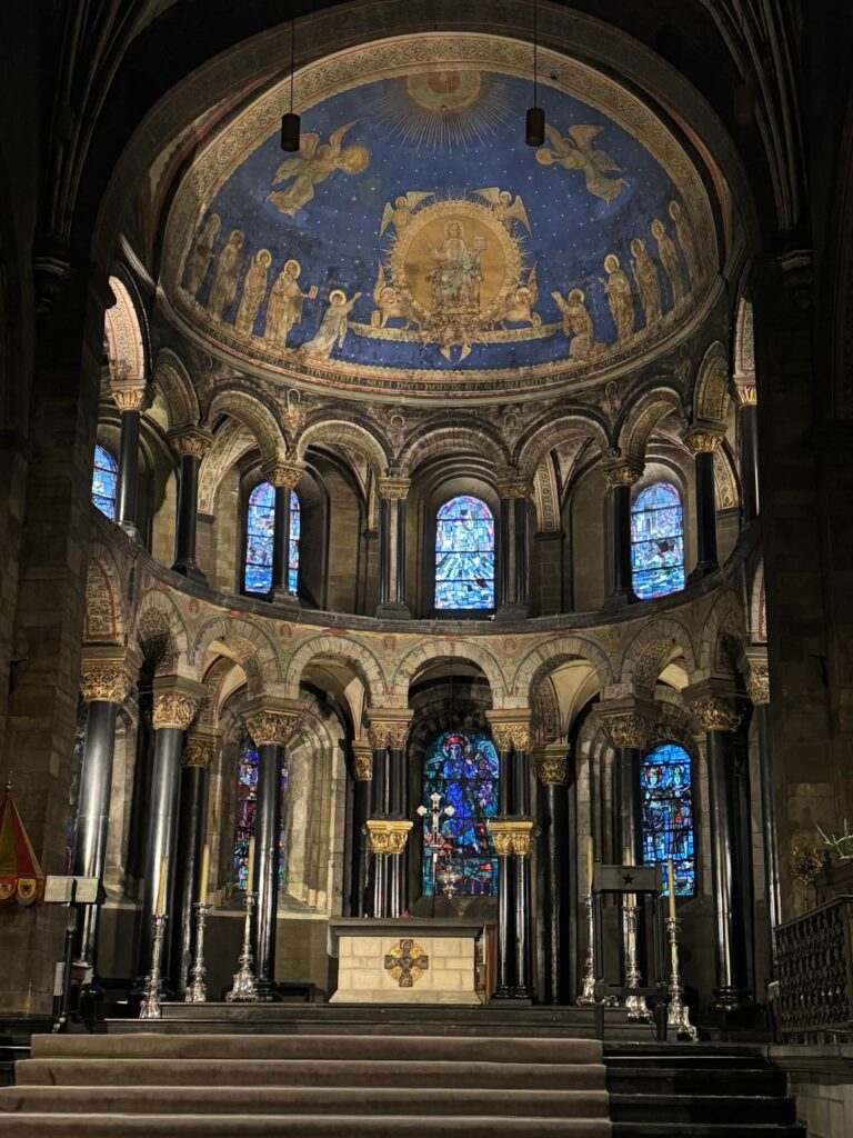 The 12th c. Romanesque church is one of the oldest churches in the Netherlands and is known in part for the painted half-dome and black colonnade.